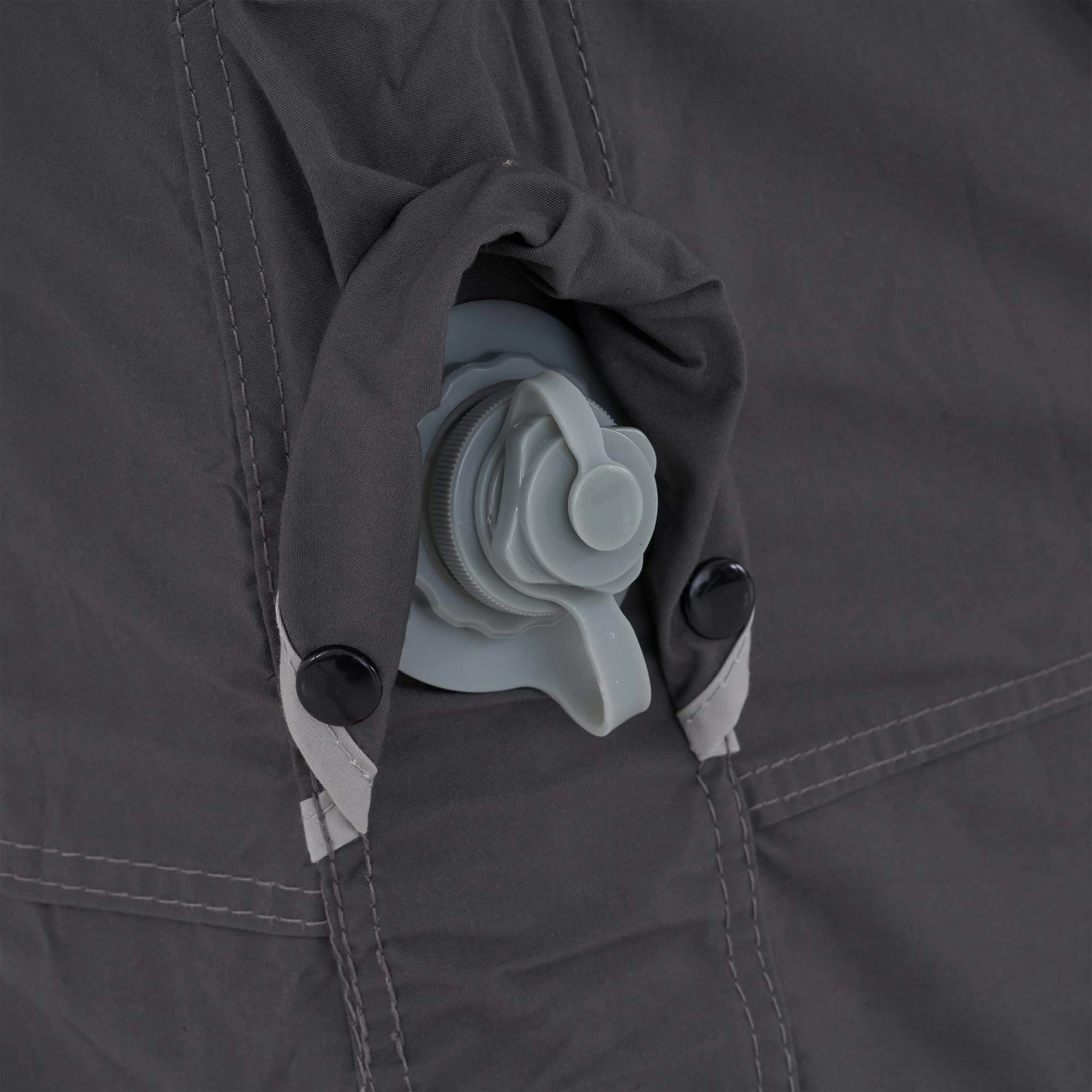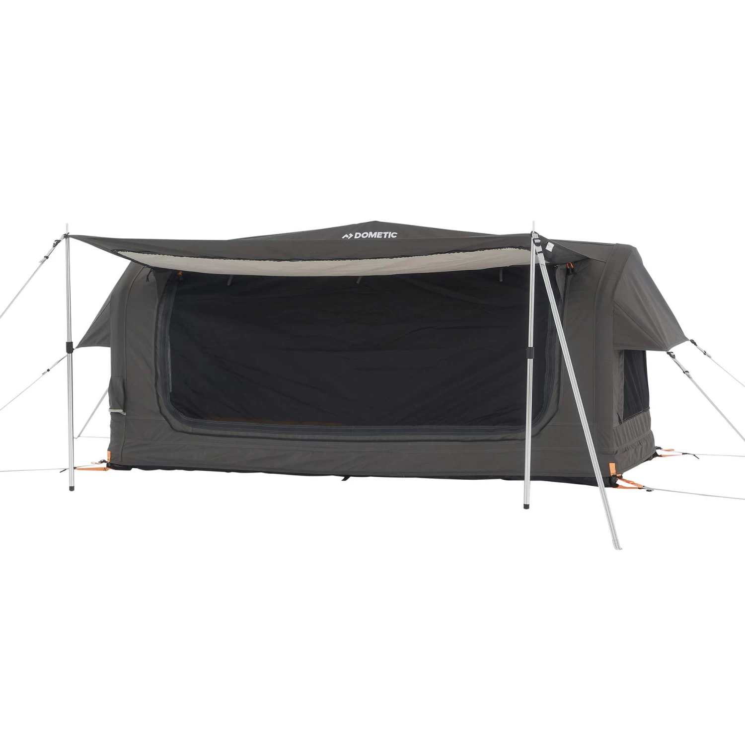 - Die ZelttĂĽr kann aufgerollt mit einem Knebelverschluss befestigt werden