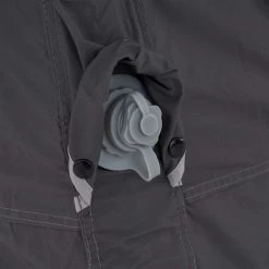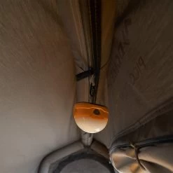 Im Kopf- und Fußbereich befinden sich große Lüftungsöffnungen mit Moskitonetz, die je nach Bedarf zum Teil oder vollständig geschlossen werden können. Im Inneren ist Platz genug für deinen Schlafsack und zum Verstauen deiner Kleidung. Zur weiteren Ausstattung gehört eine Netztasche für Kleinteile und eine Kabeldurchführung ins Innenzelt, die mit einem Reißverschluss verschlossen werden kann. Ein Karabiner erlaubt dir das Aufhängen einer Zeltlaterne unter der Decke.