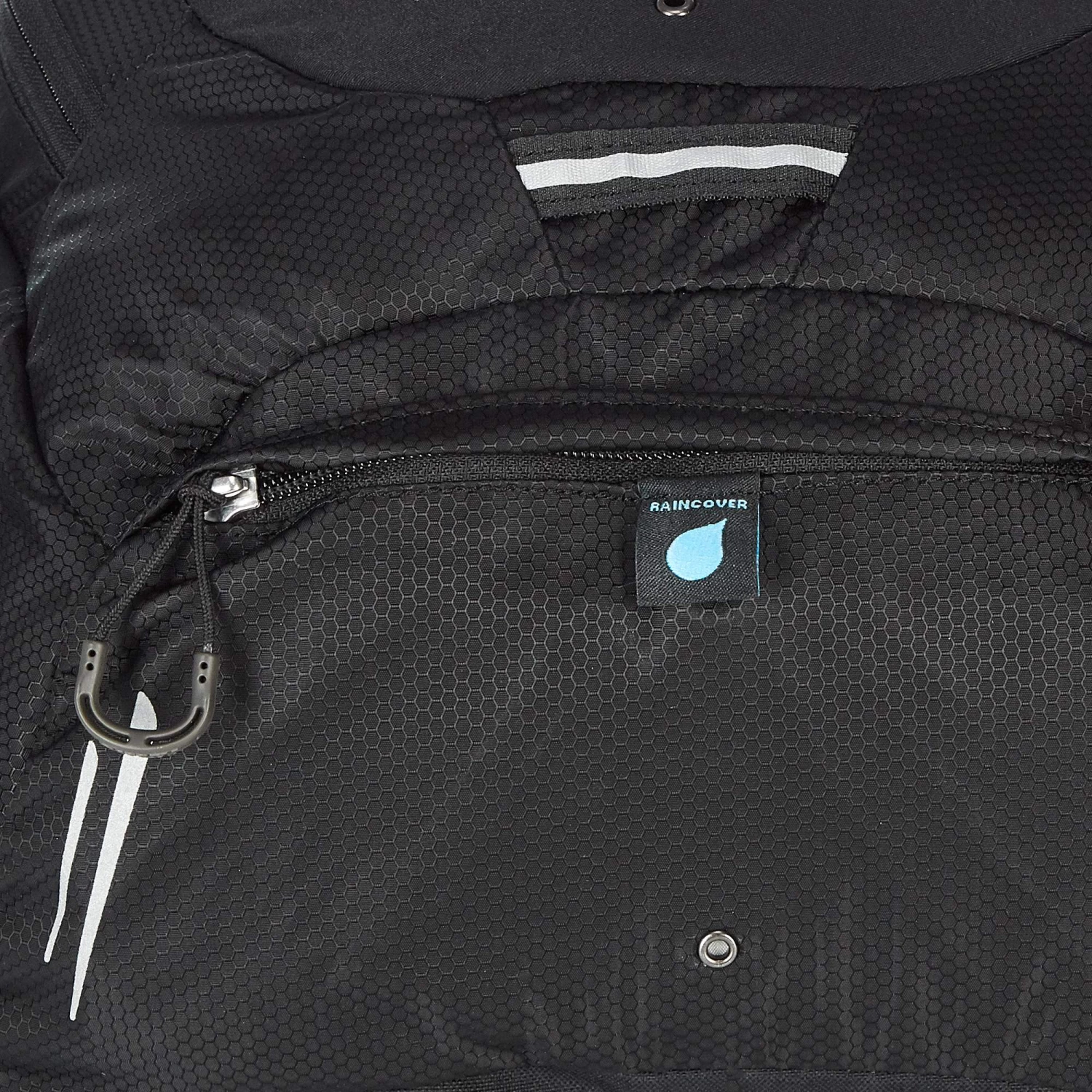 Reflektierende Designelemente, eine Halterung für ein Rücklicht und die integrierte Regenhülle in bunter Farbe sorgen dafür, dass du bei allen Witterungsbedingungen auffällst. Die praktische Helmhalterung zum Durchstecken ist für Helme mit Lüftungslöchern geeignet.